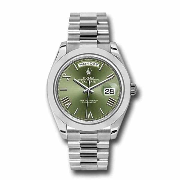 40mm 950 platinum case, screw-down back with Rolex fluting, screw-down crown with twin lock double waterproofness system, smooth bezel, scratch-resistant double anti-reflective sapphire crystal with cyclops lens over the date, olive green dial, beveled deconstructed Roman numerals, Rolex caliber 3255 automatic movements with central hour, minute and seconds hands, instantaneous day and date in apertures, unrestricted rapid-setting, and stop-seconds for precise time setting, approximately 70 hours of power reserve, President bracelet with three-piece solid links comprised of a polished center link, satin-finished outer links, and ceramic inserts, concealed folding Crownclasp buckle. Waterproof to 100 meters.