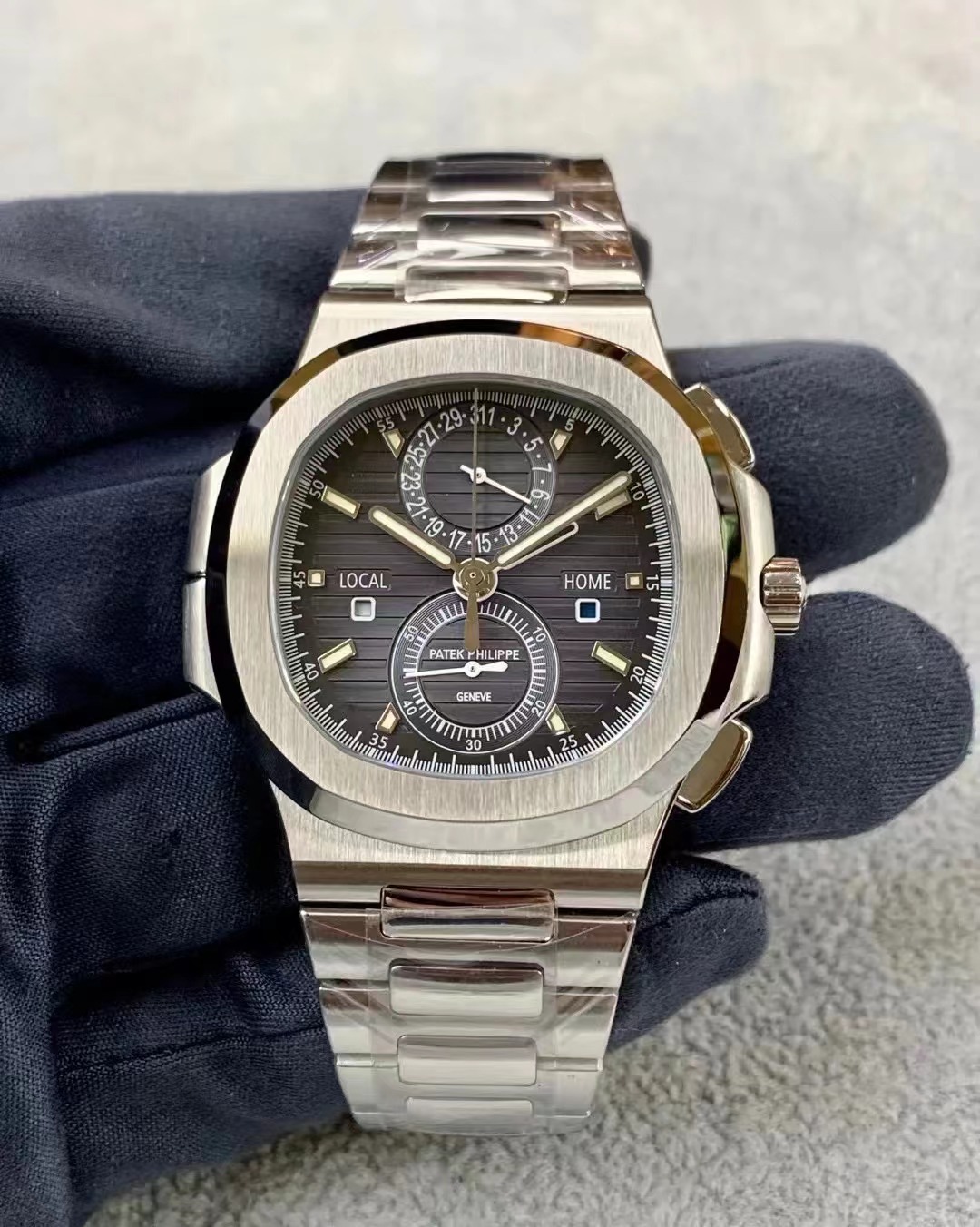 Patek Philippe Nautilus 5990/1A-001. Stainless steel case with a stainless steel bracelet. Fixed bezel. Black graduated dial with luminous hands and index hour markers. Minute markers around the outer rim. Dial Type: Analog. Date. Two - 60 seconds and date. Automatic movement. Scratch resistant sapphire crystal. Screw down crown. Case diameter: 40.5 mm. Cushion case shape. Water resistant at 120 meters / 390 feet. Functions: second-time zone, hour, minute, second.